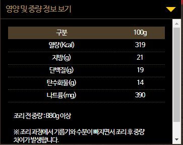 프렌차이즈 홈페이지를 확인해보면 100g당 영양소만 나와있을뿐, 한마리에 대한 정보가 나와있지 않다.
